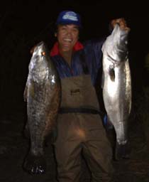 データ:●アカメ 全長91B、体重10.3キロ ●ヒラスズキ 全長86.5B 体重7.1キロ ●タックル:ロッド=パームス SGP-126M リール=ダイワSS700 ライン=エムズクエスト ロックハイパー12lb ルアー=ANRES K-TEN マリアなど