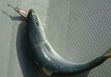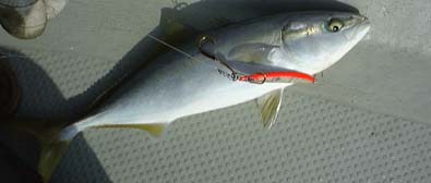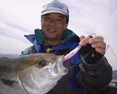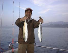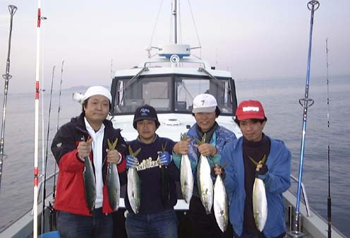 です。午前中はなかなか食いが渋くぽつぽつといった調子でした。船長は「反応がでてますよ!」といってくれるのですが。たまにコンとヒットするのですがのらなかったり、すぐバレてしまったりとまわりの人たちはみんな釣っているのにわたしにはなぜか釣れません。おいちゃんジグに交換しました。とすぐきました。やれやれです。あがってきたのは40センチクラスのヤズです。この日はハマチサイズは全くヒットなしで40〜50センチクラスまでした。お昼頃、ジグをキヨジグに交換しました。それから俄然調子がよくなり、二度目にきたのは何とアシストフックをつけていたのですが、前後のフックにそれぞれ食いついているのです。ダブルで釣ったのは初めてで嬉しかったです。結局、全体として少々食いが渋く大型はでなかったのですが全員がボーズなしで結構楽しくやれてよかったです。夕方17時すぎまでやらせていただいて船全体で40尾ほどだったでしょう。高知組の一人には対象魚以外になんと大型のアイナメが釣れたりしました。