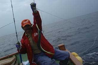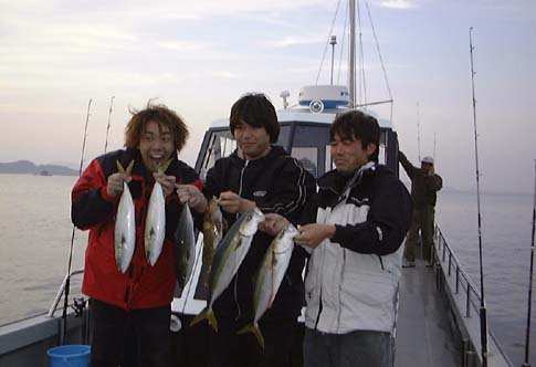 待ちに待った瀬戸内のハマチです。ゆっくりと朝6:30に伊野町で待ち合わせて、出発です。港には9:30ごろ着きましたが船頭さんとの約束は10時出航です。きょうはベタナギ、8人の釣り人は少し待っていざ出陣、ポイントはすぐ近くでした。ところがなかなかヒットしないのです。しばらくやっては移動、しばらくやっては移動、とポイントを変えましたがやはり食いは渋く他の遊漁船も日曜日というのに少し少ないようでした。どの船もなかなかロッドが曲がりません。結局、17時ごろまでやって船中で8尾でした。わたしもハマチは1尾だっけ。船頭さんもこのままではいかんと思ったのか太刀魚が食いだしているので太刀魚を釣りに行こうということになり、しばらく移動、太刀魚のポイントです。一度だけ松山の港の岸壁からミノーで釣ったことはあるのですがジギングは初体験です。高知組全員がそうでした。そこで船長にどうやるのかと聞くと、ハマチよりもゆっくりジャークしながら底から中層までを繰り返すとよいといいます。底をとって数メートル揚げてくるとグンとのりました。それが引くのです。「え! タチウオってこんなに引くの?!」やりとりしていると船長が来て「これは大ものだ」というのです。少しやりとりしているといきなりフッと軽くなったのです。「ああ ばれた」というと船長は「切られたのじゃない?」といいます。あわてて巻き上げてみると軽いのです。やはりスパッときられていました。気を取り直してジグを結んではじめると次から次とヒットします。船長は休まずにどんどん巻き上げて取り込めと言います。わたしには小型が多かったのですが、船のおもてのほうでは大型が何尾かあがっています。船長が「こんな大物は今シーズン初めてだ」とあわててカメラを取りに来ました。結局、タチウオは大当たりで1時間半ほどのあいだに全員平均5尾ほど釣ったのです。