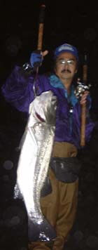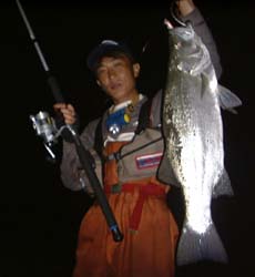 アカメねらいでいつも行く河口へ行きました。ここで1時間ほどやってみたのですが反応がありません。この日は、どこもかしこもヒラスズキが待っているような気がしていたので、明るい内に、ヒラのよく出る朝やった河口へ移動しました。ところが朝はあれほど濁っていた川がほとんど濁りがとれているではありませんか。海も凪いでいて濁りもわずかになっています。これは明るいうちはヒラはだめだろうと思いながらも、まあやってみるかとポッパーで始めました。半時間もすると夜のとばりがおりてきて薄暗くなってきましたがやはりヒラの気配はありません。この状況ではアカメだなと思いシンカーのミノーにルアーを交換して数投目、読みは的中したのです。遠投したルアーが近づいてきて流れ込みの中央へ寄せられていくとグンと一瞬とまったのです。わたしのほうは予感があったので「きた、やっぱりきた」と思ったのですが相手は????といぶかる一瞬があったのです。アカメにはよくある特徴的なヒットパターンの1つです。その???の一瞬の後、アカメは走り出しました。アカメは青物のようなスピードこそありませんが強力(ごうりき)はすごいものをもっていて、向こうむいて走り出すと70Bクラスでもまともに引っ張り合いをすると20ポンドラインもとばしてしまいます。どうもアベレージサイズ以上の力です。ラインは16ポンド(のつもりでした)、ショックリーダーなしのルアー直結なので無理はできません。ドラグは少し緩めにして、パームスの12フィートのロッドの力でたたかいました。ロッドを思い切り立ててロッドの力を利用するのです。角度が小さいくなるだけドラグに直接力がかかってくるのですが、角度を大きくするだけその弾力、復元力を利用して戦えます。こうしながらリールのハンドルをまいて寄せるのではなくロッドの角度をおおきくたもったそのままで後ろにさがり魚をよせてこんどは急いで前進しながらラインを巻き取るのです。ポンピングを自分の位置を前後させることでやっているような感じですが、ポンピングと全く違うのはロッドの角度を大きく保ったままでラインを巻き取ることができるところです。こうすると少しゆるめのドラグでも十分戦えます。とっさの走りに対してはロッドを倒せばいいのです。そうするとスムーズにドラグが効きます。