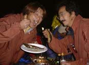 小西さんは28日、安芸に入り拙宅で泊まってもらって出航は安芸漁港を午前5:30ということになった。内川・大坪両氏は小西さんとは8年ぶりなので再会を祝していっぱいやろうということになり(土佐ではなにかというといっぱいやろうということになります)、ちょうど数日前、イノシシが手に入っていたのでそれを肴に長崎からアカメを求めて1ヶ月以上安芸市に住み着いている放浪の釣り人、山口幸之介さんもよんで28日の夜はイノシシ大宴会をやらかしたのでした。疲れている小西社長はときどきコタツで横になりながら口角泡を飛ばす土佐のようたんぼ(よっぱらい)をにこにこと暖かく見守りながら夜は更けていきました。