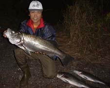 河口へ着くとすでに5人の釣り人がいました。内川さんもいます。声をかけて一休みしながら情報交換をしていると大坪さんもきました。夕方からこの人数で始めたのに暗くなりだしてもライズもあたりもありません。大潮だったので「きょうは当たりは8時からじゃ」とわたしのよそうどうり、、先ずわたしに来ました。「ひっとじゃ〜!」と大声をあげるとエラ洗い一発ではずれてしまいました。それから次々と仲間にあたるのですがバラシばっかりです。大阪からきていたとなりの河内さんにヒット、60センチまでのヒラスズキでした。その後もヒットはあるも手前まで寄せてばらしたりエラ洗いでばれたりで、18:00〜22:30までやりましたが、わたしはギブアップ、腹は減るは、腰は痛いはで仲間に声をかけて退却しました。