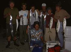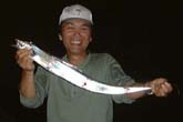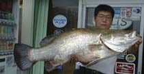 8/19、RD中野さんから午後9時ごろ電話がかかりました。どうもいつもの声と違います。すこしはずんでいます。あれ、釣りましたか、と聞くと「いや、でっかいのをかけてバラしました」といいます。Oさんといっしょに釣りをしているというので、冷蔵庫のスイカをもって駆けつけました。二人の話を聞くと超弩級のアカメだったようで「あんなのが土佐の海にはいるんですねー」と話されました。Oさんはファイトの一部始終を目撃してアカメと確信しているのですが、「ありゃあ、エイじゃったかも知れん、いやひょっとするとカメじゃったかも?」と冷やかすことしきりでした。そのうちIさんも駆けつけて4人で日付が変わる時間までやりましたが、ヒットはありませんでした。わたしは帰ることにしましたが、若い三人はポイントを変えて続けるというので「釣れても朝まで電話はしないでね」と別れました。そのとおり、朝、中野さんから電話です。「釣れました?」「別れてすぐ変わったポイントで釣りました。サンプルにいると言っていたのでキープしてあります。」というありがたい電話です。いただいたアカメは76センチ、6.12キロでした。