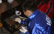 BLUEの合同?料理はこだわり飼育の地鶏料理、すなずり・せせりなど美味いこと!(写真は一生懸命地鶏を焼くまみ拓さん)