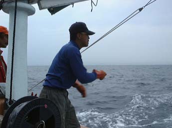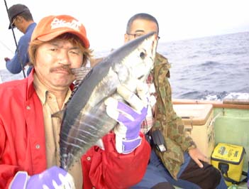 最初にわたしにあたった。お!きたきた。何だか軽い。小さなシイラだった。内川さんはジグからトップミノーに変えてやっていたがやはりシイラがヒット。それからしばらくしても目当てのヨコはまったくあたらない。これでは仕事にならないので松田船頭にたのんで漁師仕掛けでトローリングをやってもらうことにした。