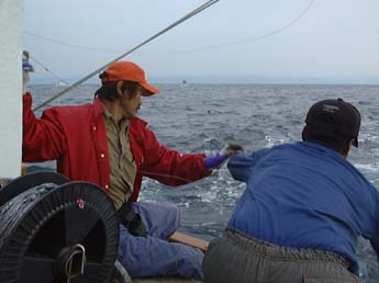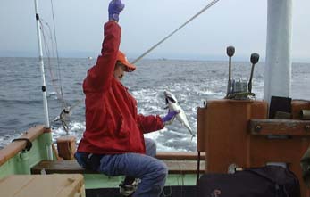 こうして取材は、ばりばりっと釣れては少しは休み、という釣りのリズムと一連の仕事のリズムに乗ってうまくはこんだ。昼頃までつづいていた天気も、曇り空からはぽつぽつと雨粒が落ちてきだして終了しようということになった。釣果はヨコが2〜3キロのもで30尾近く。他にヤイト(スマガツオ)3尾、シイラ2尾だった。目的の1つだったコシナガマグロは小西さんによるといなかったようだが、若魚だと玄人(研究者)でも見た目では判断が難しく、漁師でも選り分けていないそうで、サンプルに送るもののなかに「なんだ、コシナガがいるじゃないか」といわれたら何か恥ずかしいなどといっていた。小西さんは知る人ぞ知る魚の同定にかけては凄い目の持ち主なのである。玄人中の玄人と呼べる一人だと思う。