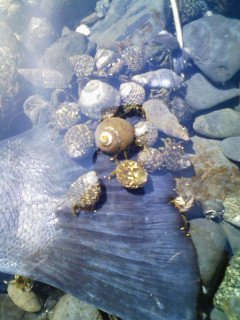 午前中に磯で釣ったそうで、面白い話をしてくれました。釣った魚をタイドプールに入れて生かしておいたそうですが後で見るとそこら中にいたヤドカリが集まってきてヒラスズキの尾ヒレに乗って盛んに食事をしていたそうです。「背びれや腹ヒレ、他の部位でもえいと思うのになんで尾ヒレだっけに集まるがやろう?」と不思議がっておりました。
