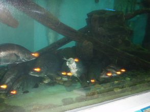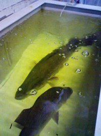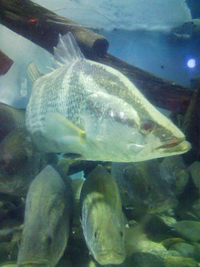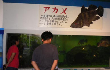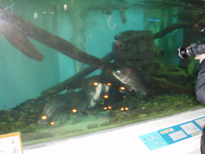08年5月4日の午後4時頃、昨年のアカメ釣り大会で裏方として大活躍してくださった岡田さんが115センチ、24キロのアカメを仕留めました。このアカメは桂浜水族館に寄贈されました。「豊かにする会」事務局長上杉さんからの情報では、現在アカメの状態は良く元気だそうです。 左の画像は水族館内の予備水槽で展示を待つアカメです。他の一尾も釣り人から寄贈されたアカメだそうです。 右側の画像は桂浜水族館の展示水槽のアカメです。現在アカメ達の状態は良いそうで、上杉さんのお話「1尾面白い個体を見つけました。落ち着きの無いアカメです。いつ餌をもらえるかと、常に興奮状態です。背鰭も立ててやる気満々です(笑) 」、だそうです。桂浜水族館でみてやって下さい。