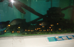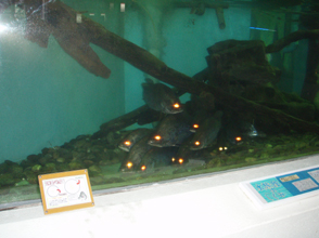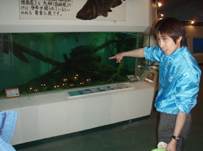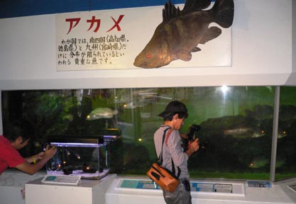 三人で水族館を巡りました。桂浜水族館といえばアカメ飼育のパイオニア、展示室入り口すぐに大きなアカメ飼育水槽がデンとあります。オオ!と声がでそうになります。アカメたちが整列し目玉をランランと紅く光らせて出迎えてくれるのです。 会員である飼育員の堀内さんが解説してくださいました。22個体入っているそうですが、岡田さんが5月4日釣って寄贈された、115センチ、24キロの大アカメがひときわ目をひきます。控えめにじっとしているのですが、並んだアカメたちのなかで極めて体高が高いためものすごい存在感があります。柴山さんはアカメとの対面は初めてだそうです。