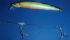 リーダーで結んでないとバラバラになりますが、リーダーで取り付けるとルアーの頭部にリーダーが通りますのでバラバラにはなりません。 |