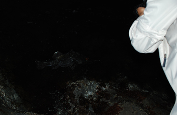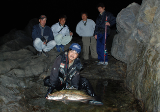 安芸市のある岬の磯場で仲間の大坪さんが夜釣りでチヌを狙っていた。 午後9時。 アタリがきた。「最初はガシラ(カサゴ)かと思った。引きが強くなって今度はチヌかと・・・、いやボラかと思った。どんどん引きが強くなってフカかと思った。近くでイカを釣っていた友人がいぶかしがるので竿を持たせたりした。 何かわからん。しばらくやり取りして寄ってきた時はヒラスズキか?と思った。ライトを照らして初めてアカメだと気づいた。アカメと判ってからは突然やり取りが慎重になった。45センチのタモ網に入れたが、身体が半分以上出ていた。」大坪さん談。 (1)大きなタイドプールで泳ぐアカメ。(2)大坪さんと愉快な仲間達。(3)リリースするぜよ。(4)リリースの瞬間。(5)磯ぎわを悠然と帰っていくアカメと撮影する朝日新聞記者。