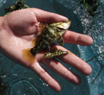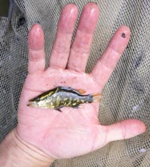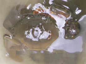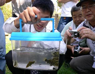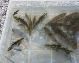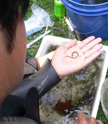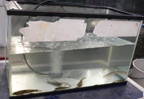 アカメ達は高知市の浦戸湾で97年に捕まえた8尾と県西部で95年に捕まえた一尾でその一尾は太郎アカメと名付けていた。太郎アカメは京大の調査活動に参加したとき捕まえたもので採集したときは全長が27センチほどであったが成長し50センチほどにもなり、標識を付けて放流を考えていた。また10センチ前後のちびアカメたちも30〜40センチになったら標識放流を予定していたのだった。