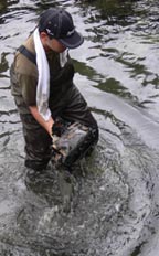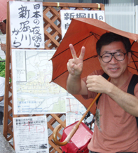 写真左:大正橋下手でアカメを採集、NHKのカメラ取材に応える高知大学生 伊佐正樹さん。