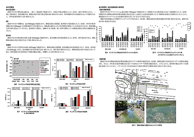 7 2013年にクロロフィル量の大きな値が記録されているが、その説明がどこにもない。この値は試料採取日以前の高知市の天気で説明できる。例えば、試料採取の前日までの2週間で見てみると、2013年は晴れの日の確率が100%、最高気温の平均値が34.9℃、2012年は71%と31.8℃、2011年は64%と31.9_であり、2013年の天気が抜群に良かったのが明らかである。瞬間的な値だけではクロロフィル量の説明はできないし、天気の影響が撤去部と公園前で異なるという馬鹿なケースはあり得ない。