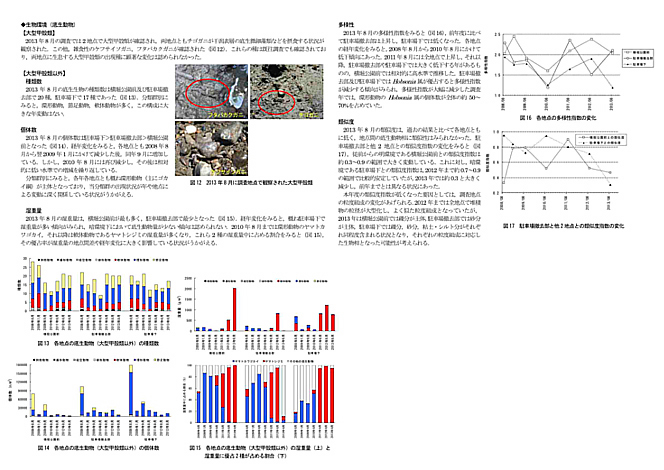3 2013年8月に、撤去部でコアマモの生育が確認されたと旧詳細版は喜んでいるが、コアマモの定着、生育、繁茂のチェックは当初の調査項目にない。「自然に生え てきてくれた」のである。もちろん、繁茂状況は私もチェックしたが、まだまだこれからという状況である。ついでながら、コアマモ群落は貴重な環境要素であるが、その群落の中にシオマネキの巣穴は形成されない。