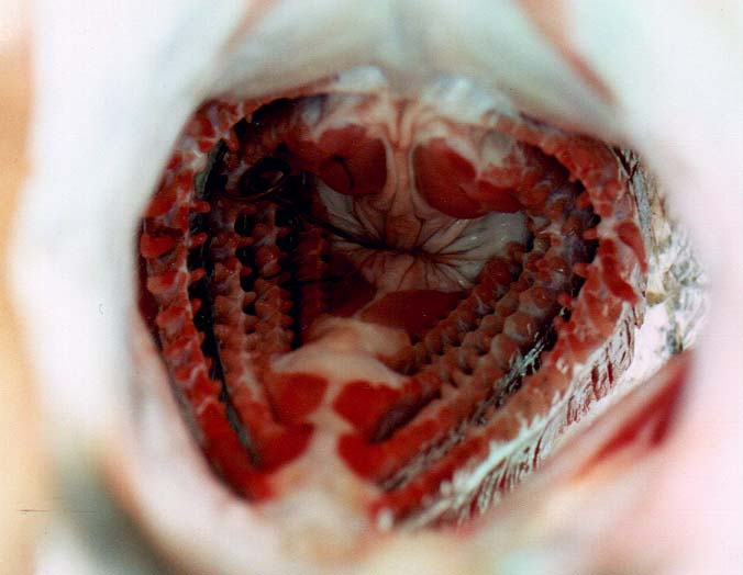 (11話)アカメのうがい アカメは祟るで書いたように、生態調査のためアカメの稚魚を数年飼育していました。その中に、太郎アカメと名付けたアカメがいました。太郎アカメは京大の調査チームの稚魚採取にはじめて参加して、わたしが捕まえた最初のアカメでした。捕まえたときには、30cm弱の2歳のアカメで長期にわたっていた京大の稚魚採取調査でも珍しい年齢で、サンプリングしたいというのを断って飼育調査したいとのわたしの希望をとうして、生かして持って帰ったものです。アカメは食事に関してはかなり保守的で、生きエビばかり与えていると、突然小魚を入れてもすぐには食べようとしなかったり、タカハヤばかり与えているとヨシノボリを入れてもたべなかったりします。特に、ヨシノボリは夏の食欲旺盛時期でも食べず何か忌避物質でもだしているのではなかろうかと考えたりしたほどです。アカメの夏の食欲はすさまじいもので、四六時中空腹なのではと思うほどで、水槽に近づくと水面に頭をもってきて胸ビレを小刻みにふるわせて甘えるような姿勢で待ちかまえます。夏のある日、谷川で餌のタカハヤを穫っていたところウシガエルのオタマジャクシが網に入りました。ムクムクと研究心?がわいてきて、似たような姿だし、色だし、旨そう?だし、水面で瞬時に餌を吸い込むからオタマジャクシを与えるとどうするだろう、食べるだろうかと、もちかえりました。