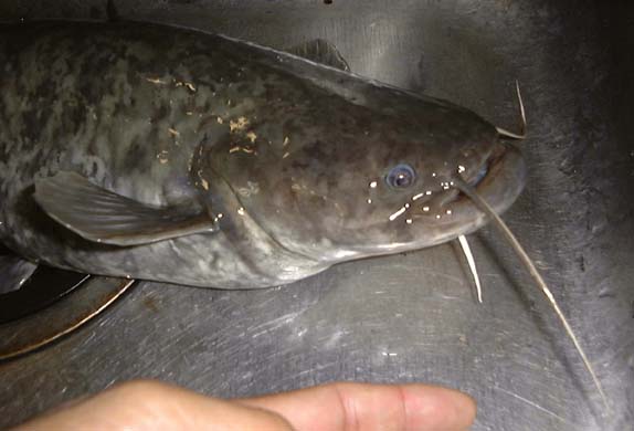 入れ物がないので新聞紙でグルグル巻きにしてガムテープで留めて後部座席の床に置いて図書館からなにやらで用事を済ませ帰宅したのはナマズを捕まえてから4時間後でした。で、家に運び込み包みをほどくとなんと元気なのです。新聞が濡れていて、皮膚呼吸ができたのでしょうか。ウナギよりも強そうです。