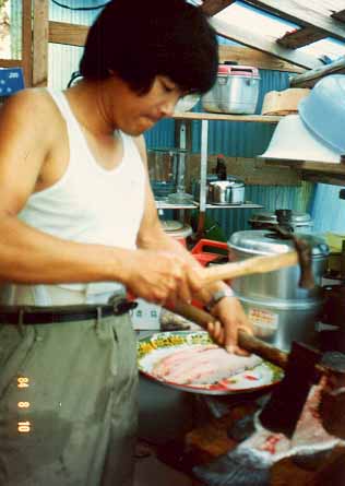 アカメは硬いと気付いたのは出刃包丁の刃がボロボロになってから、初めて釣ったアカメに思い知らされて、ハンマーとチョウナ(マサカリ)で背骨を切断しているガイド。