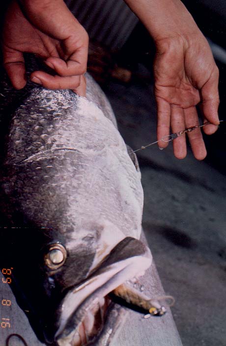 話はまだ続きます。しばらくヘタリコンでいたのですが震える手先でラインシステムを組み直して再開しました。30分ほどしてからようやく夜のとばりがおりはじめたころ薄明の水面下に巨大な魚影が目前をゆっくりと横切っていくのです。あまりの大きさに呆然と見とれていたのですが、はっと我に返りあわててルアーを投げてはみましたがまるっきり反応がありません。すぐ近くなのでルアーは思いどうりの場所を通せるのです。数回やってふっと気付きました。アイツさっきバラしたアカメで「オレを痛い目にあわせたのはどいつだ」とみにきたんではないか?