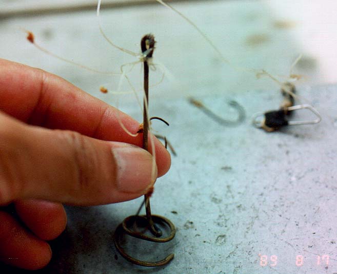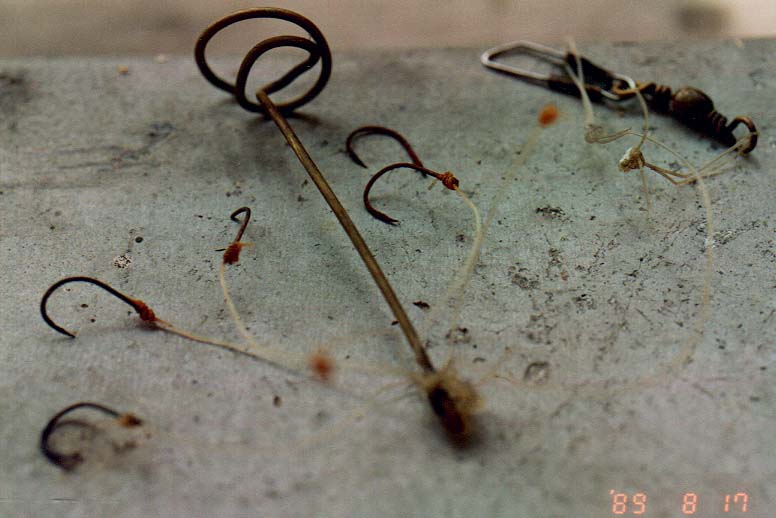 (13話)びっくりした!? 1989年8月16日、高知県東部のある河口の河川域でアカメを釣りました。それまでの自己記録魚で108センチ・21.3キロのアカメでした。10キロを越すようになるとハカリがなく検量出来ないのでいつも友人のOさん宅で検量してもらいます。ハカリに載せて計っていると鰓蓋から何か出ています。よくみるとスイベルがついたラインのようです。?????わたしはスイベルがついたラインを切ったりはしていないはずなのに「こりゃあなんじゃろう!!?」スイベルをもって引っ張ってみました。どこかに引っかかっています。こんどは口から覗いてみました。なにかコイル状のものが見えます。