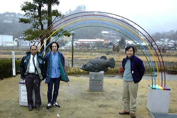 雪のおさかな館にて、左からインドネシア国立ハサヌュディン大学講師のイクバル・ジャワドさん、アカメ研究者 林さん、「アカメの国」のガイド。