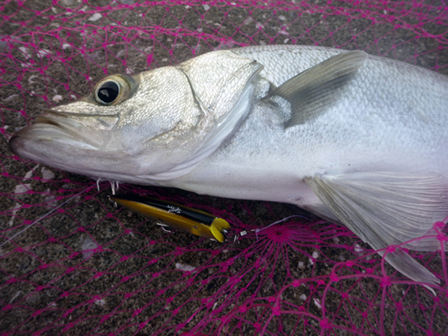 正解でした。交換して数投、ゴンとヒット。元気なヒラスズキでした。