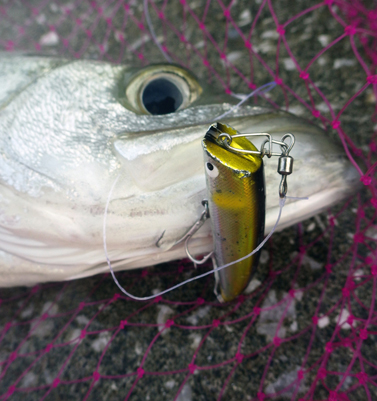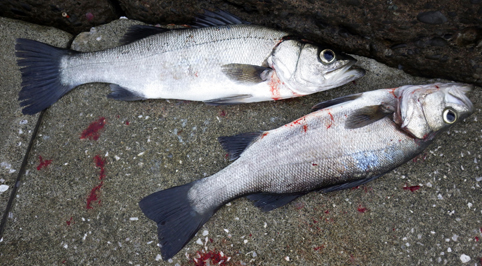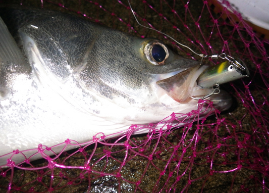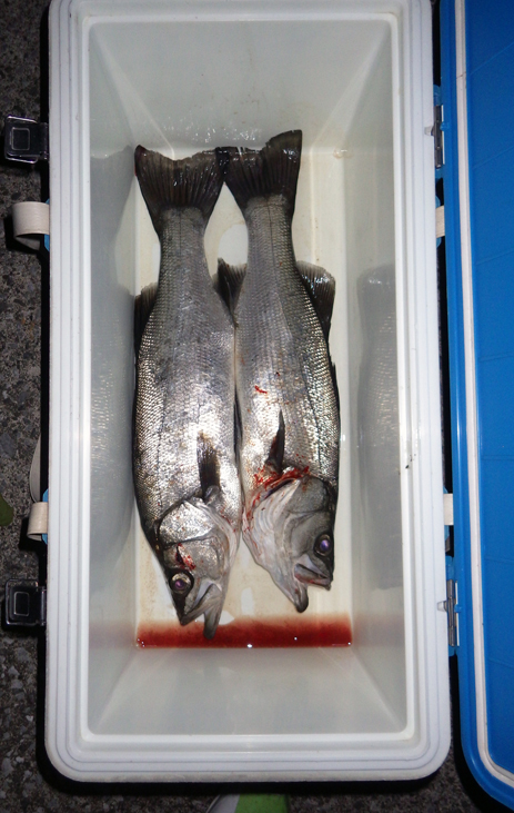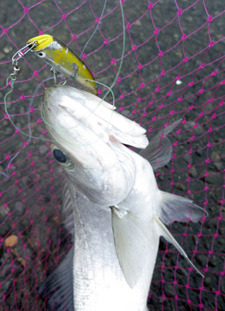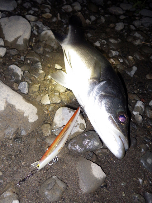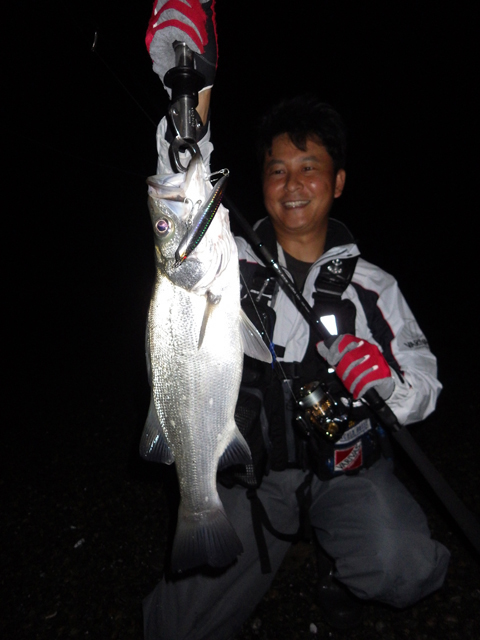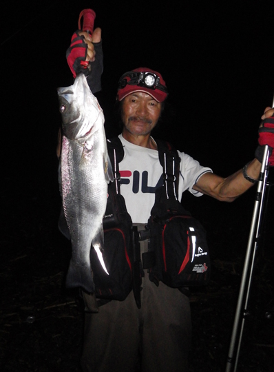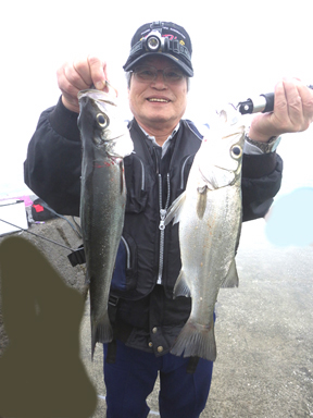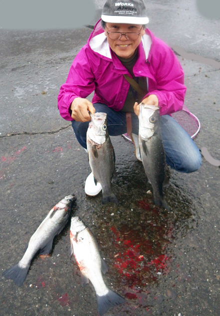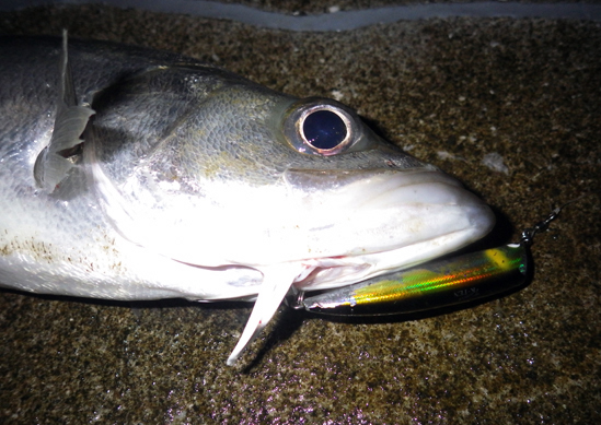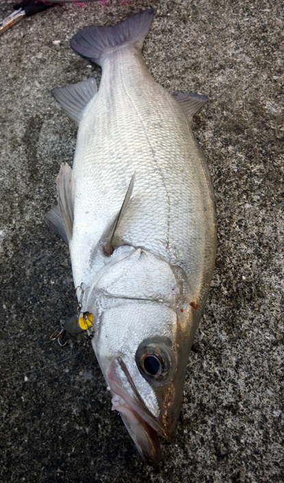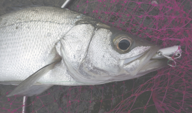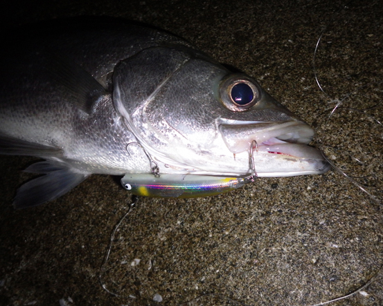 何と、どんどんばりばり当たります。サイズはそれほど大きくはないのですが、ライトタックルでしたので楽しめます。ヒット数はフックアップしなかったのも含めて10数回、バラシが6回、手前まで寄せてフックが外れ反動で飛んできて顔に刺さりました。それも左唇の直ぐ下、自分を釣ったような格好です。幸い少しだけ刺さっていたのですぐにはずせましたが、痛いながらも笑いました。60センチ弱のヒラスズキを2尾キープ。リリースしたのは2尾でした。