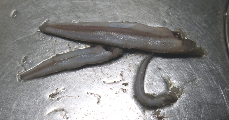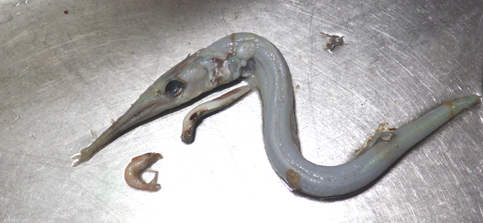 釣ったのは全てヒラスズキでした。ほとんどが胃はぺちゃんこでしたが、そんな中で1尾の大きな胃を開いてみました。48センチの小さなヒラでしたが、何と、出てきたのは20数センチはあったと思われるダツです。折り畳むように胃に収まっていました。自分の体の半分の全長はあると思われる魚を食べているのです。他に、不明の魚1尾と川の小さなエビ(スジエビ?)が出ました。総じてあまり豊かな食生活はできていないようでした。