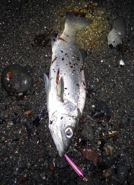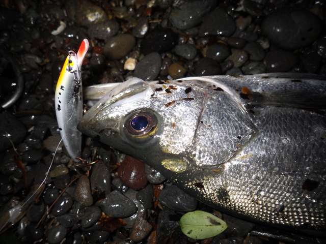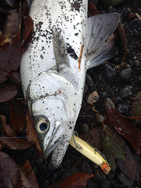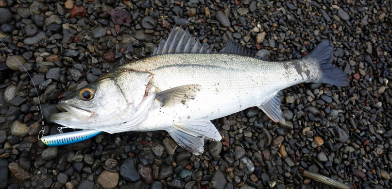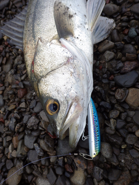 翌朝、すでに波は収まり濁りも薄くなっていて、ライズもまったくありませんでしたが、ヒラスズキを一尾釣ることができました。
