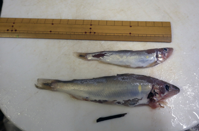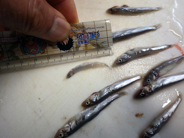 ヒラスズキたちは増水で流されたコアユを専食していたようです。この時食べていたアユのサイズは小さいもので4センチ、大きなもので7センチでした。まだ消化されていないアユを選び出してサイズを測ってみました。