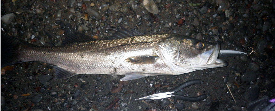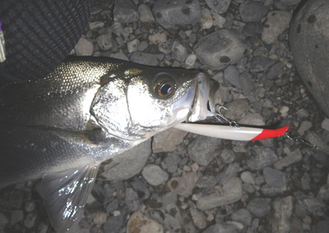 2017年4月7〜9日の釣果(2017.4.16掲載)昨年、12月マルスズキを釣ってからこれまで何度か挑戦してみたのですが、どこも反応がありませんでした。今年3月、そろそろマルスズキが良くなるのではないかと、友人に教えてもらったポイントへ行くことにしました。連絡をすると何と彼もその場にいるというので駆けつけて、二人でキャストを繰り返しましたが反応無しでした。諦めていつもマルスズキが見えるという場所に案内して貰って移動。街灯の明かりが届く水面をのぞき込むと、いるわいるわ、ゆっくりと動き回りながらときどき反転しては何かを食べています。彼はこれまで何度も挑戦しているが、釣ったのは1回だけでほとんど見向きもしないと言います。けっして彼がへたくそなわけではありません。ルアーの名手なのです。釣れないという言葉に疑いを持つわけではないのですが追い求める魚の群を目の当たりにしながら何もしないでいられるほどの大人ではありません。