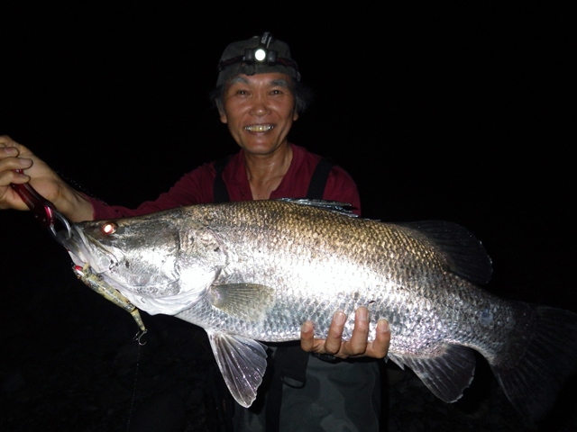このアカメを手にするまでにどれだけアカメに翻弄されたことか。ラインをとばされ、フックを延ばされ、テトラに巻かれ。手持ちのルアーが乏しくなった。この場所で大坪さんと2人、1週間ほど毎晩、手玉にとられた。この時、最大と思われるアカメは大坪さんがかけて20分あまりやり取りをしたものだった。隣で見ていて、それこそ手に汗を握ったが、アカメが水面近くにでてきたときは大きなウズがまいた。川の上流へ引き波を立てながらラインを引き出していき、最後は手前に突っ込んで来てテトラに入り込みラインが飛んだ。呆然とした。