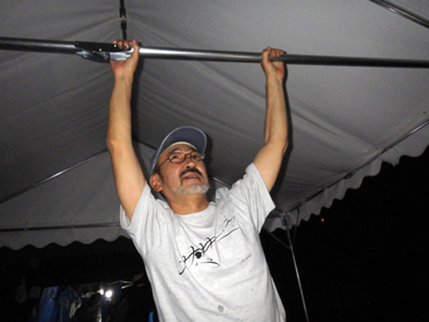 2014年第6回アカメ釣り大会で暴風雨にみまわれ、「いつかスズキの大会で何人かぶら下がったまま飛ばされたことがあるよ」などと恐ろしいことを言いながら本部テントが強風に吹き飛ばされないようにぶら下がる二宮正樹さん。