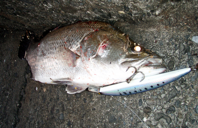 寄せたアカメを見て思い出しました。こんど高知市にできる自然科学博物館での展示用標本に使うため50センチクラスのアカメが1個体欲しいとたのまれていました。仲間の岡田さんにお願いしてありますが、まだ入手できていません。このアカメは60センチを切っているようでした。手元で半身を出してみてみると魚体もじつに美しく、コンディションもよいアカメでした。これは大事にランディングして鱗一枚落とさないようにしようと慎重になりました。ギャフを巧くかけて持ち上げたまま、落ちるまでその状態を保って魚体を傷つけないようにしようとしばらくそのままでいました。アカメも弱ってきたのでそろそろ車のクーラーに収めようとテトラを移動しはじめたのですが、最後のあがきなのか突然暴れました。丁度足場の悪いところでなんとギャフから外れてテトラの間に落ちてしまったのです。幸いルアーはそのまま口に掛かっていたのでリーダーを掴んで引きづり出すことはできましたが、魚体は鱗が沢山剥がれて標本には無理です。もうリリースもできない状態だったのでキープして格部位を標本にすることにしました。