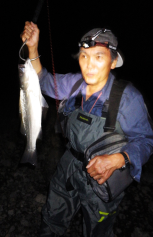 夜のとばりがおりてきたころ突然後ろから「どう?」仲間の内川さんでした。「東側でやっていて、少し大型とおもうようなヒットがあったが、流れが西向きなのでまわってきた」と言います。もくもくと続けましたが全く反応がありません。内川さんの話では東側では流されて海に入ったアユ群のモジリが時々見えていたそうなのですが。