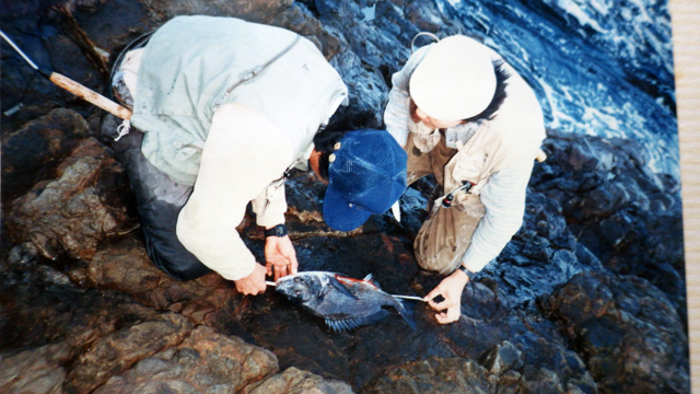 当然のこと、当時は全くの無知。スズキ釣りの延長で挑戦するも、繰り返しラインを切られ、フックを伸ばされ…。相手の力は想像をはるかに超えていた。試行錯誤しながらタックルを強化して挑み続け、84年にようやく手にした初の64センチ。小型ながら、戦い尽くして横たわる古武士をほうふつとさせる風貌と深紅の目を見て、こんな魚がいるのかと感動して足が震えた。