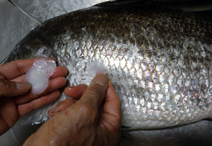 ヒラスズキの体型もそれぞれ個性があるのですが、このヒラスズキほど極端なせっぱりは滅多に見ません。レッドサーモンの雄のように背中が盛り上がっています。 ヒラスズキは美しい。そして美味しい。