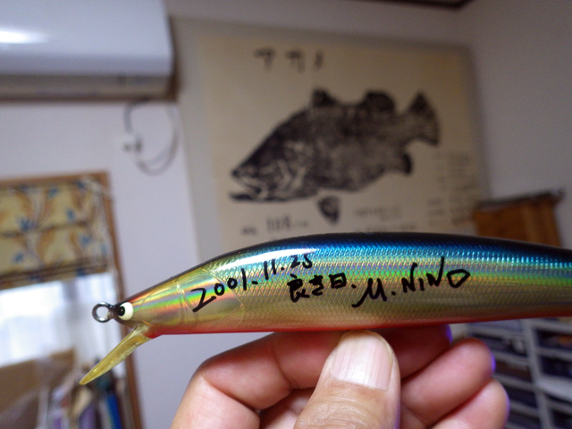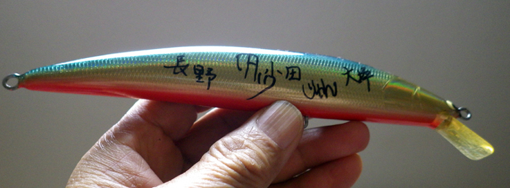 タックルハウスの2002年カタログの制作のため営業の音田さんとK-TENの設計者二宮さんが四国に入って大坪さん宅で一杯やるということになり、長野と内川さんにもお呼びがかかり集まった。ロックダンスの小田さんはタックルハウスのモニターでわたしたちとも仲良くさせてもらっている。われわれクラブの3人は最近はフィールドで揃うより一杯やろうぜよと集まることの方が多くなってきた。アオリイカの刺身、グレのタタキどれもこれも新鮮な土佐のサカナを肴に同じ喜びを共有する釣り人同志、宴はもりあがった。以前からアカメ用のルアーを作ってやると約束してくれていた二宮さん、お会いするたび気にしてくれていた。律儀な人である。これはどうですか?と見せていただいたのはまだ試作・テスト段階で発売間近のK-TEN BK175Sだった。見るからにタフでよく働きそうな気配を感じさせる。今回はこれだけしかないという貴重なテスト用をくださるという。これはもったいなくて使えません、市販が開始されてそれを使わせてもらいますので今日の記念に制作者のサインを入れて下さい。タックルの殿堂にいれます。と、二宮さんのサインをいただいた。「2001.11.25 良き日 M.NINO」と。その裏面にきょう集った仲間全員のサイン。