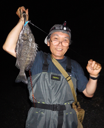 「トップできた」とのことです。おめでとうと記念撮影。この日の釣果はこれだけ。18時から21時頃までやると前期高齢者のわたしはよれよれでした。