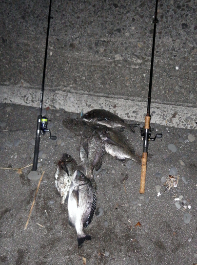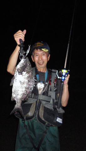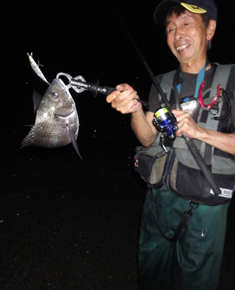 一人3投で交替しながら挑戦することにしました。私の番の時とうとうルアーに食い付いたのでした。それが、40数センチの老成したチヌだったのです。