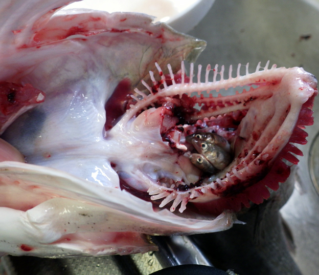 ある小河川の河口で釣った3尾のヒラは、磯の魚であるニザダイの幼魚を何尾も、もう1尾はニザダイの他に25センチはあろうかというグレを食べていました。別の河口域で釣ったヒラは大きなアユを2尾たべていましたが、同じ日に同じ場所で釣った2尾のヒラの胃には何も入っていませんでした。大増水で大量のアユが海に流れ込んだと思われるのですが、なかなか簡単には食べることはできないようです。