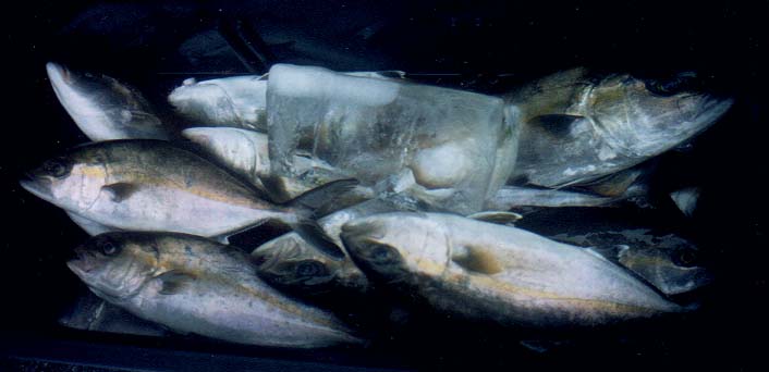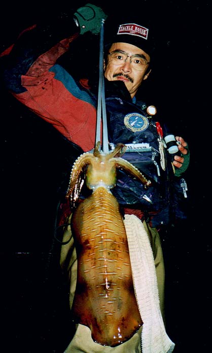 こまい(小さい)けんどイカじゃ! 1999年4月には3.5キロのアオリイカを釣釣ったぜよ。3キロオーバーがどっさりあがりゆう。1キロや2キロは太いとは言わんぜよ。こんまいこんまい(ちっさいちっさい)。どんどん糸を出されて捕れんががようある。 とは、大坪さんの弁。 ガイドはこんなめっそうもないことはよう言わん。おお〜い、大坪さんおれんくの冷蔵庫すきまがどっさりあるぜよ。ア!いかん。アカメでいっぱいじゃ!!ひひひひひ |