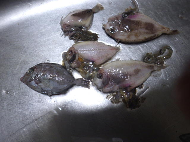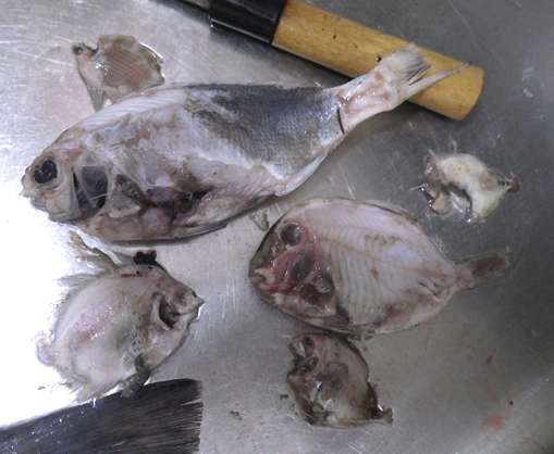 胃から出てきたチヌの食べ物を見てみると以外とイガイを多く食べていました。料理したチヌは先ず刺身、アラは塩汁と味噌汁で食べることにして最初は味噌汁、刺身も汁も旨かったです。そして、1尾まるごと煮付けにして食べましたが、孫は「美味しい、おいしい」と食べてくれました。