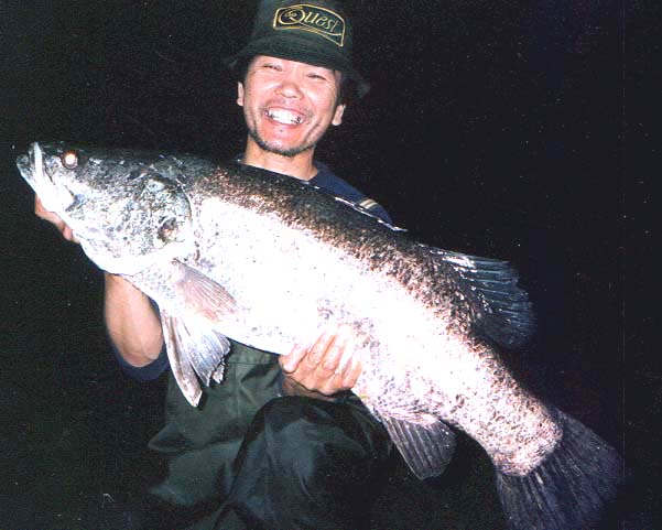 1989年頃から何年もスワックの辻本 隆さん、中村信夫さんたちと土佐レッドアイの3人が高知県西部の磯で年末年始、よく遊びました。ヒラスズキ三昧でした。中村市(現四万十市)のある磯を辻本さん、大坪さんと3人で攻めた時のこと、サラシの中でなにやら果敢にルアーにアタックしてくるのです。しかし、のりません。「くるけど、のらん」という私の大声に集まった大坪さん、辻本さんは、「なんやあれは?」「ひらめや?」とか言うのですが、サラシの中、ルアーを攻撃して反転していく姿は少し黒っぽいのです。
