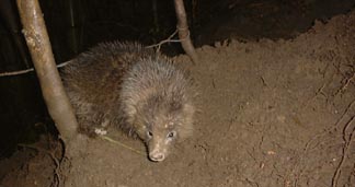(写真左上より) ●03.10.3 約60キロのメスイノシシ ●03.12.9、約40キロの大穴を掘ったメスイノシシ ●ニホンシカ ●大穴をほった小型のアナグマ ●タヌキ |