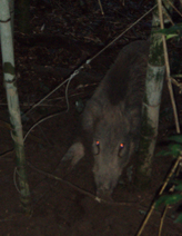 22日に殺したハミはまたイノシシにあたえました。食べ方を見ておりますと、鼻で先ず頭部を突き回していました。ときどき「オエ〜」となっています。しばらくつつきまわしてから、前足で踏んづけておいてひきちぎりながら食べます。しかし、大好きでたまらないという食べ方ではありません。「まあ、他に喰うもんがないから喰ってやるか」というような感じです。以前父親がにわとり小屋に侵入していた大アオダイショウを殺してイノシシにあたえたそうですが、そのときもハミと同じような反応だったようです。内臓は食べませんでした。