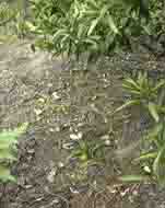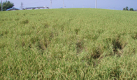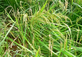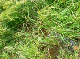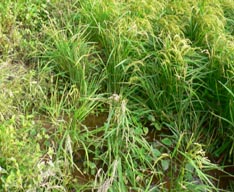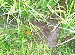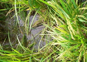 イノシシが田圃に侵入すると被害は食害だけではありません。稲の株や茎を踏み込んでしまいます。また、ヌタをうって一面をどろどろぐちゃぐちゃにしたりします。 下の2枚の写真は食害で稲穂が真っ直ぐピンと立っているでしょう、米粒をしごいて食べてしまっています。 |