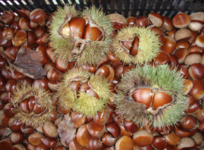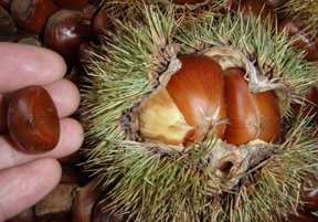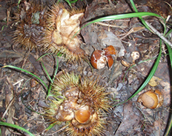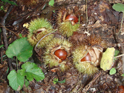 今年は台風の被害がないためか、山栗が豊作です。イノシシと競争して拾っています。写真中のイガに入った栗は栽培種で丹波栗といいます。でかいでしょう!手に持っているのは山栗で標準サイズです。小さなものは小指の爪よりも小さいものもあります。今年は毎日鱈腹食べています。 |