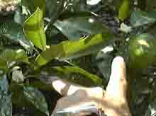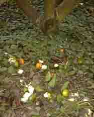 我が家の西の山の上にある蜜柑畑でイノシシが悪さを始めたので駆除をしてほしいと依頼されました。見に行きますとどうやら1頭か2頭が侵入しているようです。ここでは過去三年間にわたって駆除をしました。最初は被害も激しくて蜜柑畑一面が蜜柑の皮で黄色く染まっていました。イノシシは蜜柑の皮をきれいに剥いて食べるのです。畑の耕作者が見に行くと5頭ほどのイノシシの群が蜜柑の木にかきついて、後ろ足で立ち上がったようになり、蜜柑を食べているということでした。被害の状況を見て「これがたまるか」とワナをかけ駆除してきました。その成果もあり今年は被害も少ないようです。 それでもあの巨体が満腹するまで蜜柑をたべるので一晩の被害もかなりなものなのです。 写真は早稲蜜柑の興津という品種です。まだ色はあまりついていませんが、かなり甘くなっています。イノシシは甘くなったものから食べます。糖度をどうやって知るのかわかりませんが、ハクビシン・タヌキも甘い木を集中的に襲撃します。 (写真:上左より (1)指先の白く見えるのが引きちぎられて残った蜜柑の皮でヘタの部分です。(2)(3)食い散らかした蜜柑の皮 |
