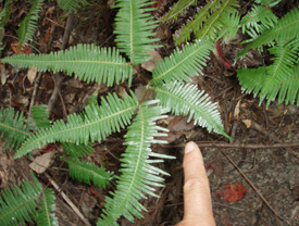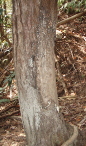 写真中:けものみちのシダにつけられたヌタ場の泥の痕跡。 写真右:けものみちの側にある赤松。イノシシがスリツケを続けため半分樹皮が剥がれてしまっていました。松の木からすると「オイ!ええかげんにせえよ!!」というところでしょう。